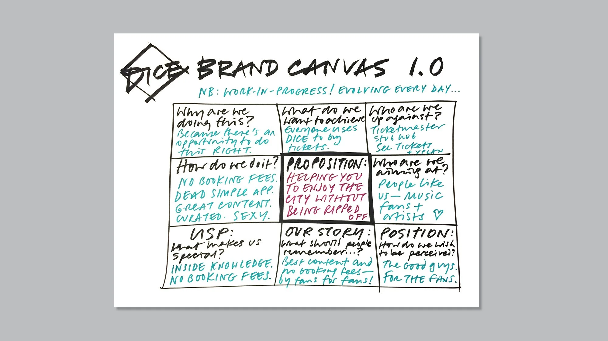 Working with a very small team at ustwo on account of the fact that the founders of DICE had no budget and this was to be a partnership, we quickly got a prototype off the ground with the visual style and tone of voice I was after. Our lead designer, Elg, scanned in my handwriting and created a ‘Travis’ font for all headline text in the app, and our lead engineer made sure that the user experience flowed exactly as I had plotted it out in wireframes on paper. The team grew after the MVP was born, and I focused on building the brand itself, starting with ideas for marketing and promotion. To keep us excited and aligned, I used a special technique I had developed based on the classic ‘brand canvas’ exercise – a grid containing answers to nine carefully crafted questions: